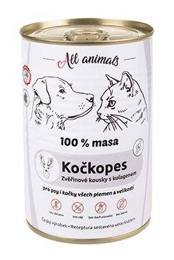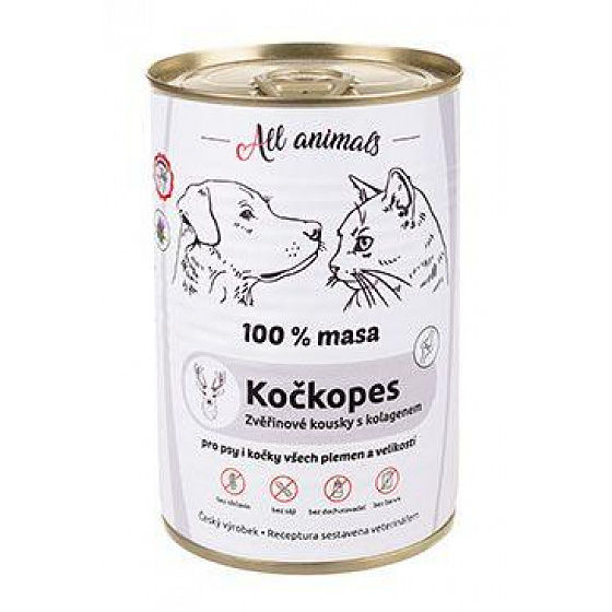 Az All Animals monoprotein konzerv kollagénnel szuperprémium eledelt jelent minden méretű és fajtájú kutya és macska számára. Vad- és vadhúsdarabokat tartalmaz, kollagénnel kiegészítve, amely támogatja a mozgásszervi rendszer működését. A konzervát gabonafélék, ízesítők, tartósítószerek és színezőanyagok nélkül készül. Ez egy nagyon ízletes, tápláló és könnyen emészthető takarmány. A kíméletes feldolgozás garantálja a finom ízt és illatot. Készült?Csehországban, helyi alapanyagokból. Máriatövis olaj hozzáadásával.