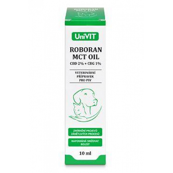 Roboran MCT OIL CBD 2% + CBG 1% egy jóváhagyott állatgyógyászati készítmény, cseppek formájában, amely a természetes kannabidiol és kannabigerol széles spektrumú hatásait használja ki. A kannabinoid összetevők MCT olajban vannak feloldva, amelyet kíméletesen nyernek ki kókuszolajból.