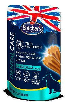 Csemegék a kutyák egészséges fogaiért - A Butcher's Dental Care csirke ízű snack szeletek kiegészítő eledel felnőtt kutyák számára. A 180 g-os csomag közepes méretű pálcikákat tartalmaz, amelyek méretüknél fogva ideálisak a közepes méretű fajták számára. A kutyakajákat szükség szerint kell adni (nem helyettesítik a teljes értékű étrendet).