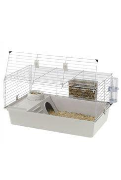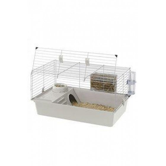 Tengerimalac ketrec felszereléssel. Nem mérgező műanyag. Egy padlóval, amely egyben házként is szolgál, egy tállal, amely a padlóhoz rögzíthető, hogy a tengerimalacok ne tudják elmozdítani, egy itatótállal és egy széna etetővel.