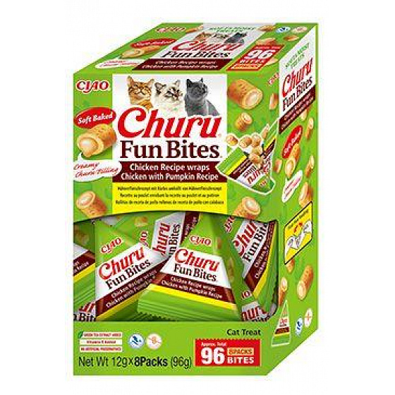 Churu Fun Bites finom párnás falatok lágy krémes középpel, amelyek ötvözik a puha textúrát az ellenállhatatlan ízzel. Kiváló minőségű alapanyagokból készülnek, mint például a tanyasi csirke és a sütőtök, nem tartalmaznak gabonaféléket, tartósítószereket vagy mesterséges színezékeket. A taurin és az E-vitamin tartalmának köszönhetően támogatják a háziállatok idegrendszerének egészségét, immunitását és általános vitalitását. Rázza meg a csomagot, hogy felkeltse macskája figyelmét, és élvezze a sok szórakozást. Ideális több macskát tartó háztartások számára, valamint kisebb termetű macskák (kevesebb mint 3 kg) esetén.