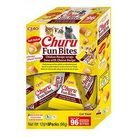 Churu Fun Bites finom párnás falatok lágy krémes középpel, amelyek ötvözik a puha textúrát az ellenállhatatlan ízzel. Kiváló minőségű alapanyagokból készülnek, mint például a tanyasi csirke, vad tengeri tonhal és sajt, nem tartalmaznak gabonát, tartósítószereket vagy mesterséges színezékeket. A taurin és az E-vitamin tartalmának köszönhetően támogatják a háziállatok idegrendszerének egészségét, immunitását és általános vitalitását. Rázza meg a csomagot, hogy felkeltse macskája figyelmét, és élvezze a sok szórakozást. Ideális több macskát tartó háztartások számára, valamint kisebb termetű macskák (kevesebb mint 3 kg) esetén.