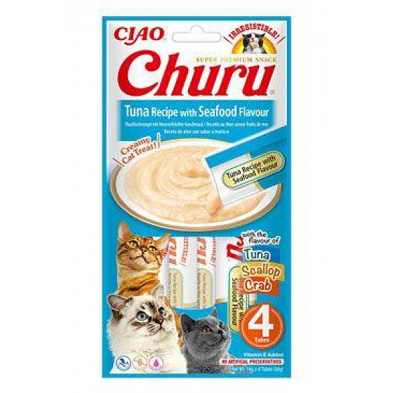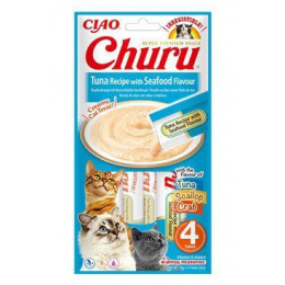 Churu húspüré macskáknak tonhallal és tenger gyümölcseivel. Finom, természetes finomság krémes, gabonamentes állagú.