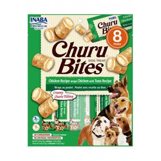 Puha, párna alakú, vadon élő tengeri tonhalból és szabadon tartott csirkéből készült Churu húspürével töltött finomság kutyáknak. Szaftos, puha és extra finom húscsemegék gabonafélék nélkül. Egészséges, alacsony kalóriatartalmú, tartósítószer és mesterséges aromaanyagok nélküli snack. A Churu Bites innovatív, lágy állaga lehetővé teszi, hogy játékos és interaktív módon töltsön időt kutyájával. A Churu Bites extra ízletes húsfalatokat közvetlenül "a kezedből" tálalhatod, így a jutalmazás új módját fedezheted fel. A Churu Bites szórakoztatja Önt és kutyáját! Ezek a Churu Bites gabonamentes kutyakaják zöldtea-kivonattal és E-vitaminnal is gazdagítottak.