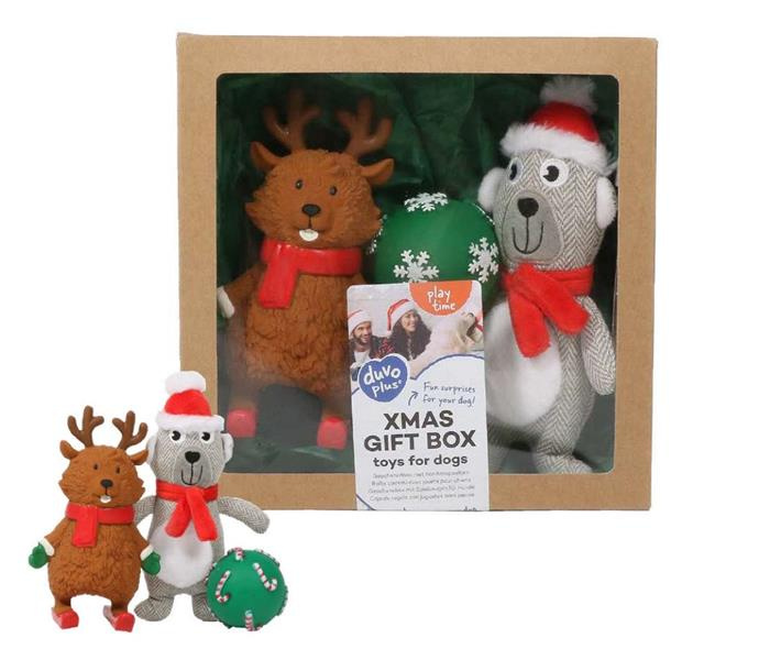 DUVO+ Karácsonyi ajándékdoboz kutyáknak 3 játékkal