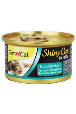 SHINY CAT - Finom, tiszta húsból készült konzerv - csak természetes. A dobozban finomra vágott csirke és garnélarák látható.