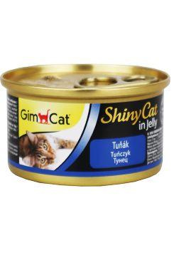 SHINY CAT - Finom, tiszta húsból készült konzerv - csak természetes. A dobozban finomra vágott tonhal és garnélarák látható.