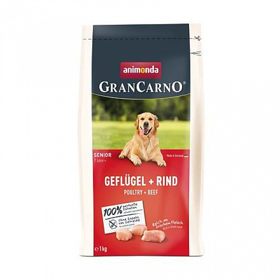 GranCarno ideális eledel kutyáknak egészen idős korukig, és kifejezetten úgy lett kifejlesztve, hogy megfeleljen az idősebb kutyák igényeinek is.