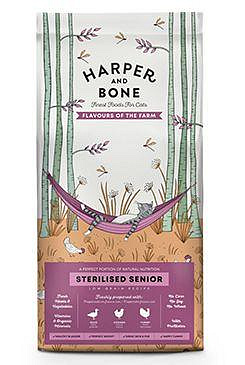 Harper and Bone Cat Senior Sterilised ízek farmból, kizárólag a legkiválóbb alapanyagokból, magas hústartalommal, szuperélelmiszerek és friss zöldségek hozzáadásával, amelyek biztosítják a jótékony tápanyagokat és a természetes ízt a tökéletesen kiegyensúlyozott táplálkozásért.