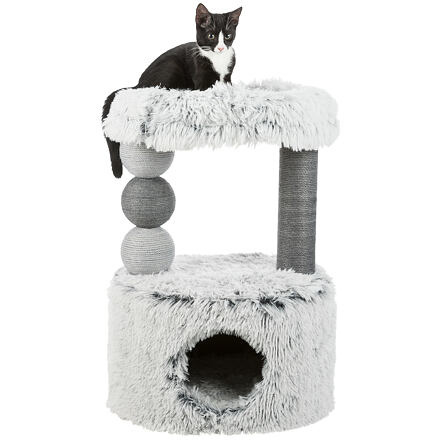 HARVEY kaparófa, kakukk, 2 oszlop, pihenőpad 73cm, hosszúszőrű plüss, szürke