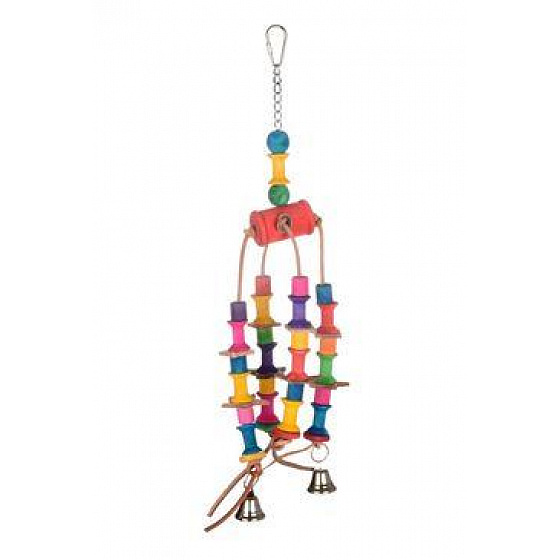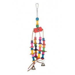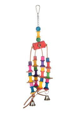 Fából készült játék egzotikus állatoknak görgőkkel és csengettyűkkel, amely alkalmas kis, közepes és nagy egzotikus állatok számára.