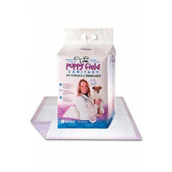 A Puppy Field egészségügyi betéteket Puppy Field méretben irodai és otthoni használatra tervezték. felhasználásuk:- műtétekhez és kennelekhez- műtét utáni állatokhoz (az állatot egy párnába csomagolva viszi haza, amely felfogja a vér és testnedvek szivárgását)- több alomnyi kölyökkutyához, inkontinens állatokhoz és beteg kutyákhoz A párnák rendkívüli nedvszívó képessége biztosítja a tiszta otthont és környezetet, amelyben az állatok mozognak. Jól felszívják a nedvességet és a szagokat.A szőnyeg 3 funkcionális rétegből áll: egy vízhatlan réteg a padló felé, egy nedvszívó réteg középen és egy puha, nem szőtt szövetréteg a felületen .Méretek: 90 x 60 cm.25 db egy csomagban.4 csomag dobozban.