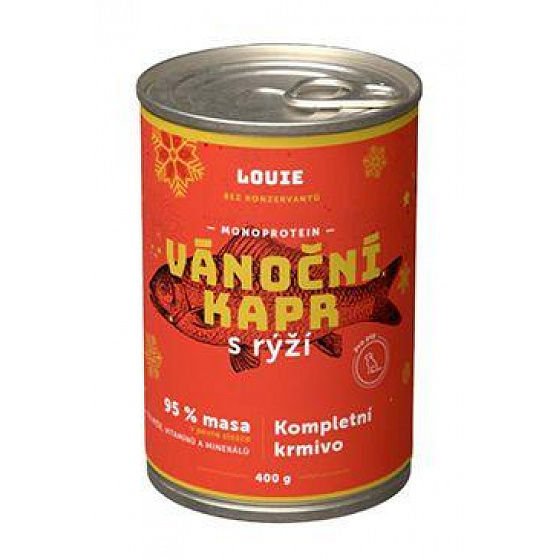 Louie karácsonyi pontya egy ünnepi hangulattal teli limitált kiadás. A ponty finom húsa rizzsel kiegészítve még a legnagyobb kutyaínyenceket is elbűvöli. Könnyen emészthető, omega-3 zsírsavakban gazdag és felesleges adalékanyagoktól mentes. Tökéletes karácsonyi lakoma a négylábú családtagoknak.