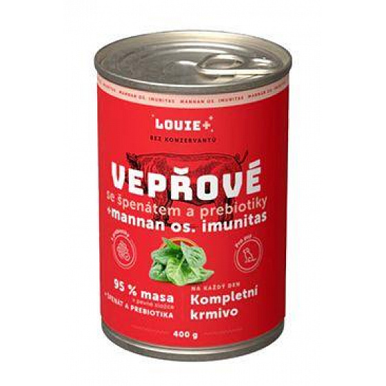 Leírás Louie Dog konz. Sertéshús spenóttal és prebiotikumokkal 400g