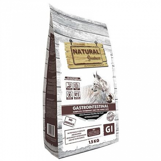 Natural Greatness GASTROINTESTINAL egy teljes értékű hipoallergén, gabonamentes recept felnőtt macskák számára, akik bélfelszívódási zavarokkal küzdenek. Ez a GRANULÁLT takarmány a MOS prebiotikum jelenlétével jellemezhető, amely javítja a tápanyagok felszívódását, továbbá magas emészthetőséggel a magasabb nátrium- és káliumtartalomnak, valamint az állati eredetű fehérjéknek köszönhetően, amelyek magas biológiai értékkel bírnak.