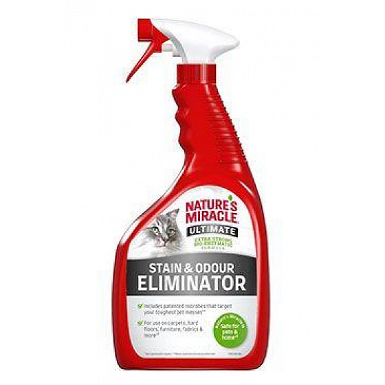 Nature's Miracle® Ultimate Stain & Odour Eliminator Cat egy olyan készítmény, amely a makacs macskaszennyeződések eltávolítására szolgál. Kivételesen erős bioenzimatikus összetétel szabadalmaztatott mikroorganizmusokat* tartalmaz, amelyek szerves szennyeződéssel érintkezve enzimeket termelnek. Ezek az enzimek könnyen és hatékonyan eltávolítják a háziállatok legmakacsabb szennyeződéseit, beleértve a vizeletet, az ürüléket és a hányást, miközben semlegesítik a kellemetlen szagokat. Az enzimek addig működnek, amíg el nem távolítják a szennyeződéseket. Az Ultimate Stain & Odour Eliminator Cat ráadásul egy olyan termék, amely különböző felületeken használható – szőnyegeken, kemény padlókon, bútorokon, szöveteken és másokon. Ha az utasításoknak megfelelően használják és tárolják, az Ultimate Stain & Odour Eliminator Cat biztonságos a háziállatok és az otthon számára. A Nature's Miracle® Ultimate Stain & Odour Eliminator Cat ideális eszköz a legmakacsabb macskaszennyeződések eltávolítására, és könnyű, friss illatot hagy maga után.