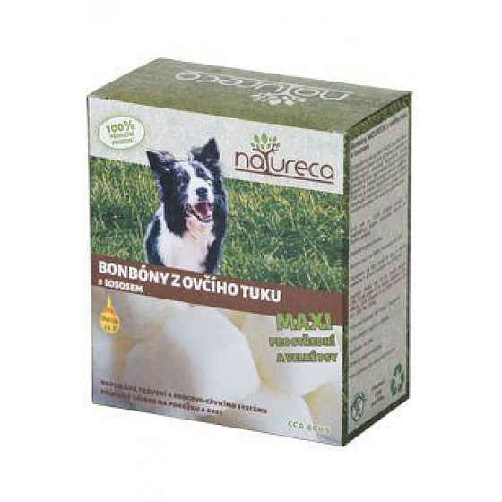 a NATURECA eredeti juhzsírból készült cukorkák lazacolajjal olyan természetes termék, amely támogatja a szervezet ellenálló képességét, a bőr és a szőrzet minőségét, segíti az emésztést, valamint pozitív hatással van a szívre és a szív- és érrendszerre. A birkazsír ízletes kiegészítője a napi étrendnek, amely A-, D-, E-, K-vitamint, valamint omega 3, 6 és 9 zsírsavat tartalmaz.
