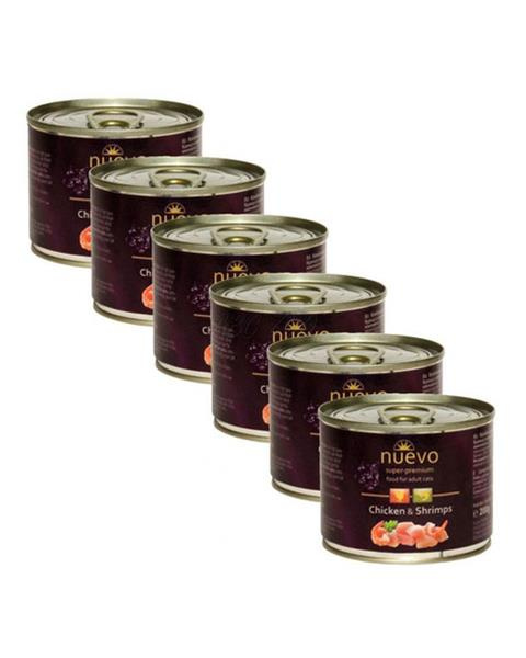 NUEVO cat Adult Chicken & Shrimps bal. 6 x 200 g-os konzervdoboz