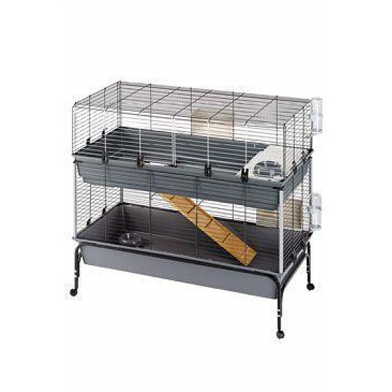 Ez egy valódi ház, amelyet teljes mértékben a rágcsáló barátaid életére terveztek! A Rabbit 120 Double egy tágas ketrec nyulak számára, amely két szintre van osztva, és egy hasznos létra köti össze. A csomag tartalmaz egy fém állványt kerekekkel. Az állomás alkalmas több rágcsáló egyidejű fogadására, és szilárd fémszerkezetből készült. A drótháló speciális, korrózióálló lakkal van bevonva, míg az oldalsó műanyag oszlopok még erősebbé és stabilabbá teszik a ketrecet. Két széles műanyag tál hatékonyan gyűjti össze a szennyeződéseket és maradványokat, és megakadályozza, hogy kijussanak a ketrecből. A Rabbit 120 minden tartozékkal fel van szerelve, hogy a lehető legjobb kényelmet biztosítsa rágcsálóinak: szénatartó, itatópalack, etetőtálak és egy kis ház a pihenéshez. A ketrecet széles ajtókkal egészítették ki felül, amelyek biztonsági zárakkal vannak ellátva és teljesen kinyithatók, valamint alul tolóajtókkal, amelyek kifejezetten a rágcsálók védelmére lettek tervezve.