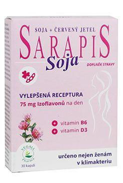 A Sarapis Soja a menopauza idején lévő nők számára kifejlesztett étrend-kiegészítő. Vörös lóherét, méhpempőt, méhpempőt, C-vitamint, D3-vitamint, vasat és B6-vitamint tartalmaz.