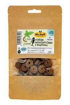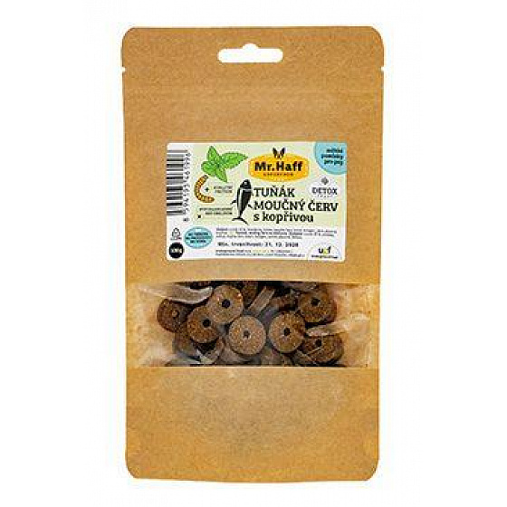 Félpuha, rovarfehérjét tartalmazó, a kutyák táplálását szem előtt tartva készült finomságok. Nem tartalmaznak gabonaféléket vagy baromfifehérjét, így kiváló választás az ételallergiában szenvedő kutyák számára. Színezékek és ízesítők nélkül. A tonhal által biztosított kiváló minőségű fehérjék és zsírok mellett a lisztkukac is nagy mennyiségű ásványi anyagot és vitamint tartalmaz. A csalán segíti az anyagcserét és kiváló méregtelenítő gyógynövény.