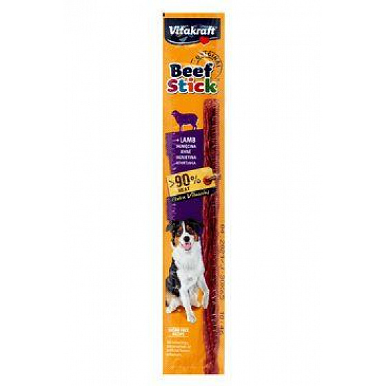 A népszerű Vitakraft Beef Stick marha- és bárányhússal (magas hústartalommal). A jutalomfalat felnőtt kutyák számára készült. Az összetevők nem tartalmaznak mesterséges aromákat, színezékeket vagy tartósítószereket.
