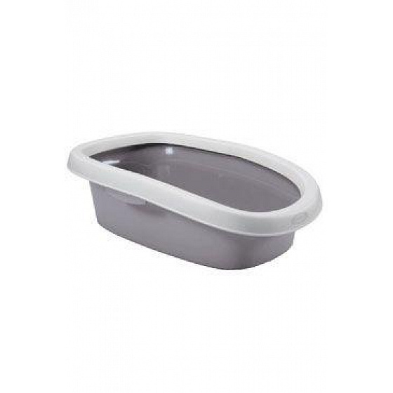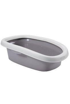 Tágas, nyitott alomtálca macskáknak, megerősített peremmel, amely megakadályozza az alom kiömlését.