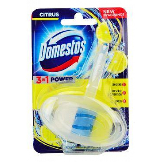 Domestos WC blokk 3 az 1-ben Pine tisztán tartja a WC-t, megakadályozza a vízkő kialakulását, és hosszan tartó frissességet biztosít citrus illattal minden öblítés után.